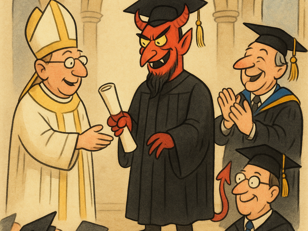Og det sker i de dage, at Antikrist modtager et æresdoktorat i teologi på universitetet i Oxford, thi han har vist sig at være en særdeles dygtig teolog. Hæderen kommer efter afhandlingen om den såkaldte bibelløse bibelfortolkning, “Står der skrevet…?”, som er en undersøgelse der viser, at Bibelen slet ikke taler om Gud.